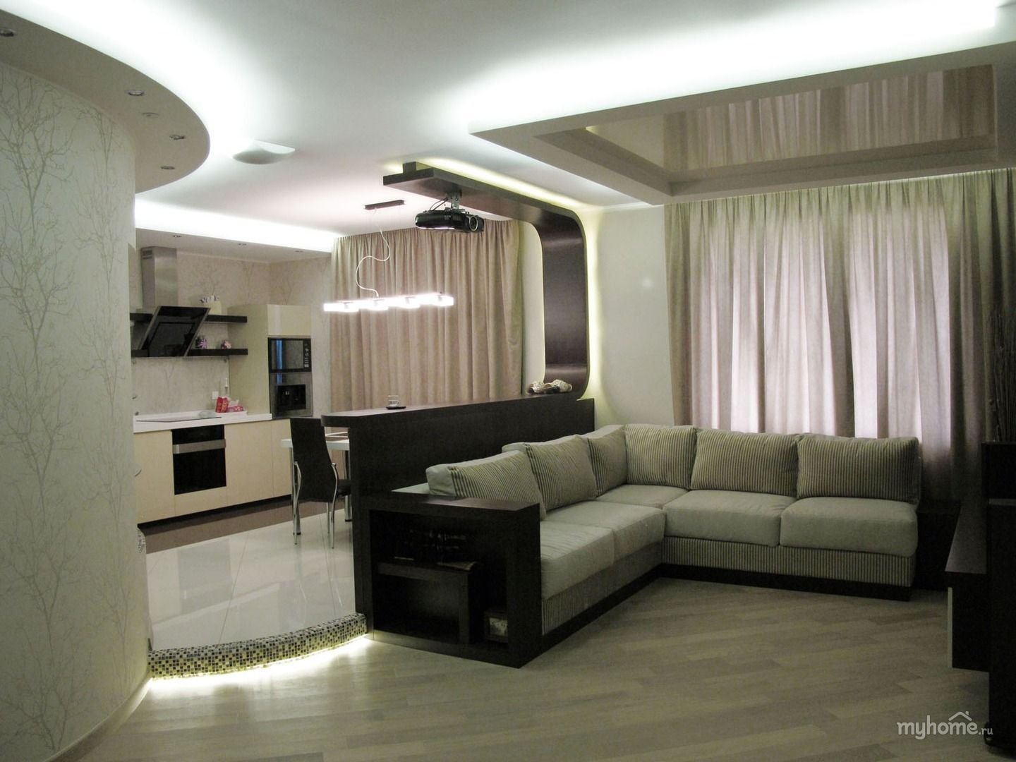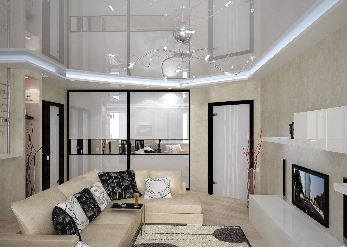 Натяжные потолки в кухне гостиной