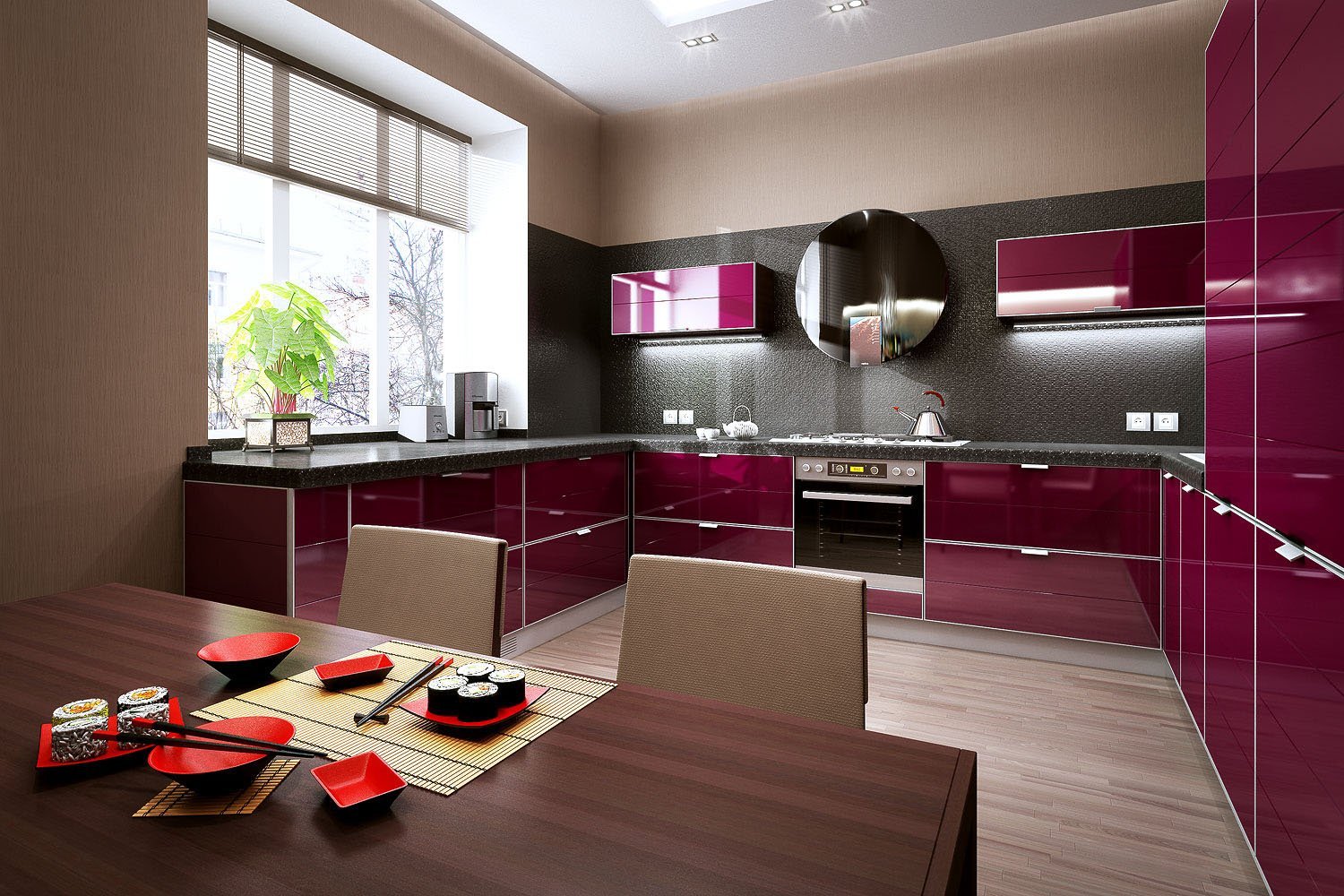 Красные шторы в интерьере кухни