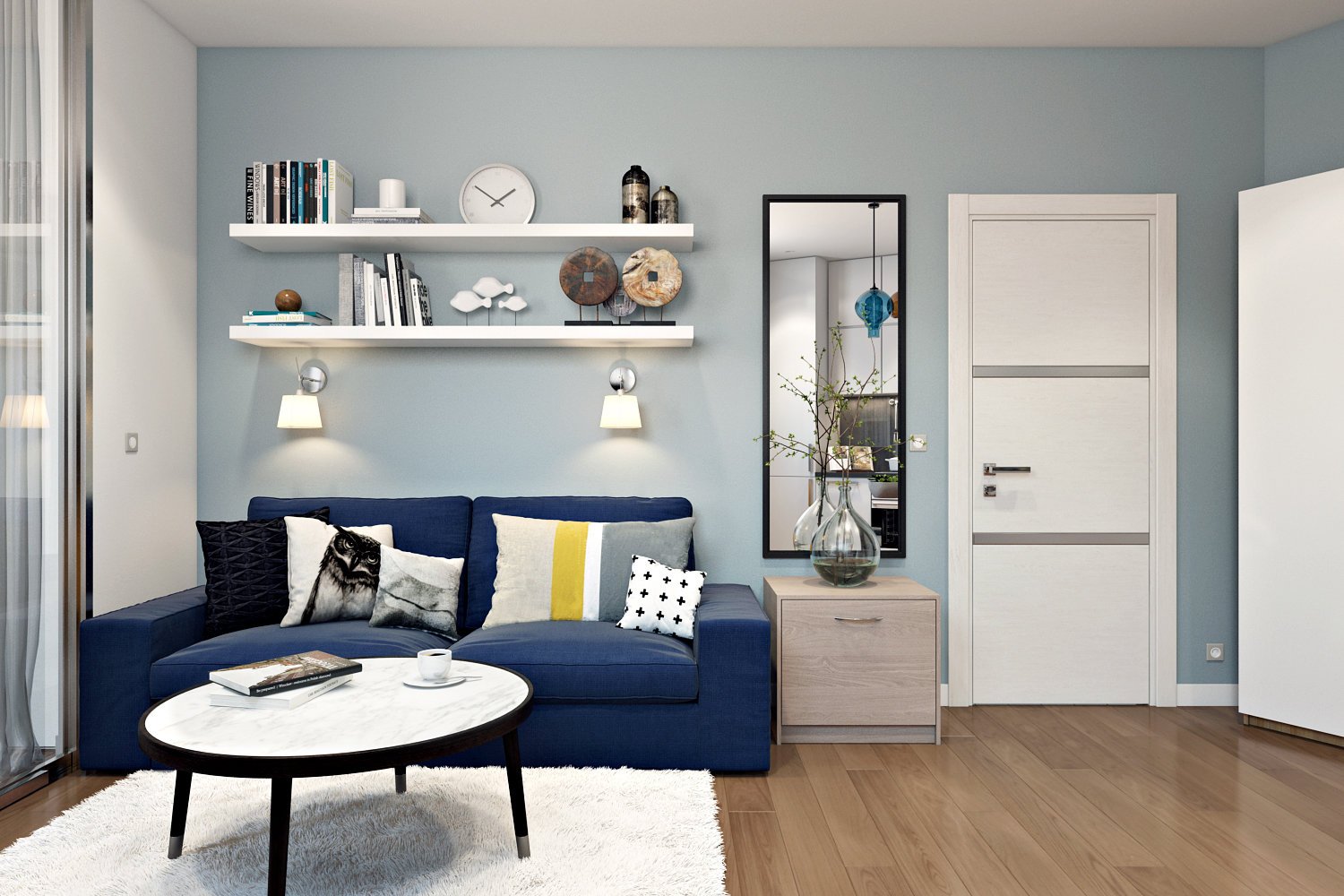 Серо голубая гостиная с дверью