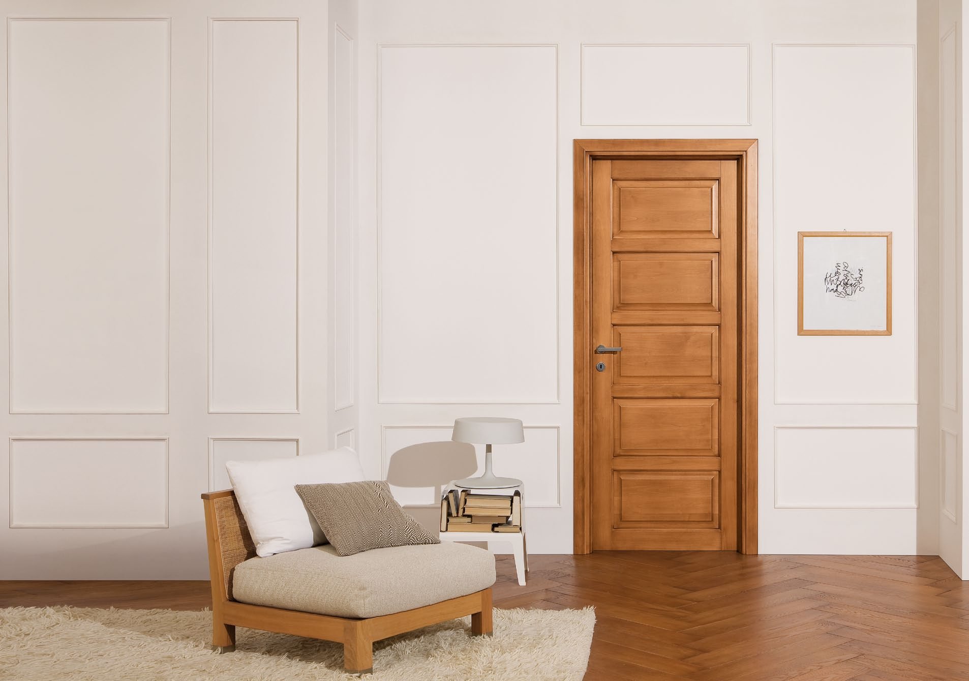 Деревянные двери и белые стены в интерьере