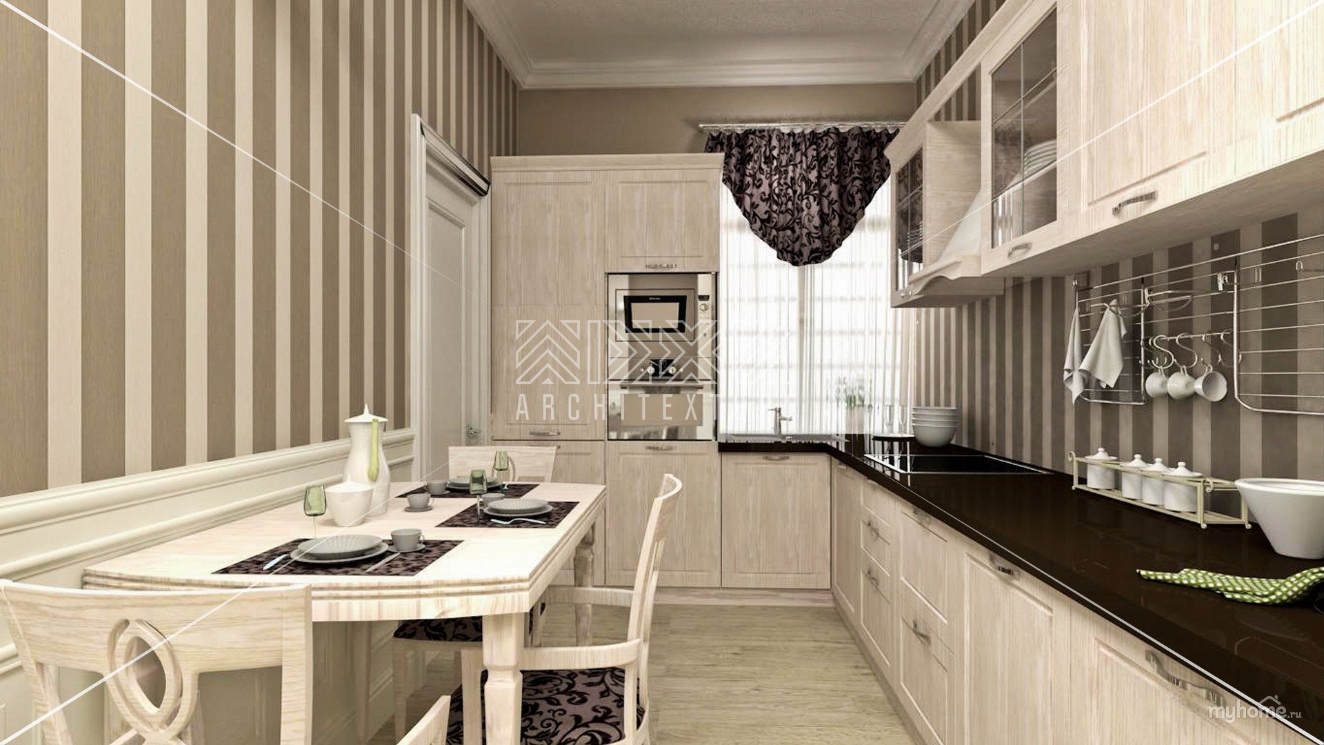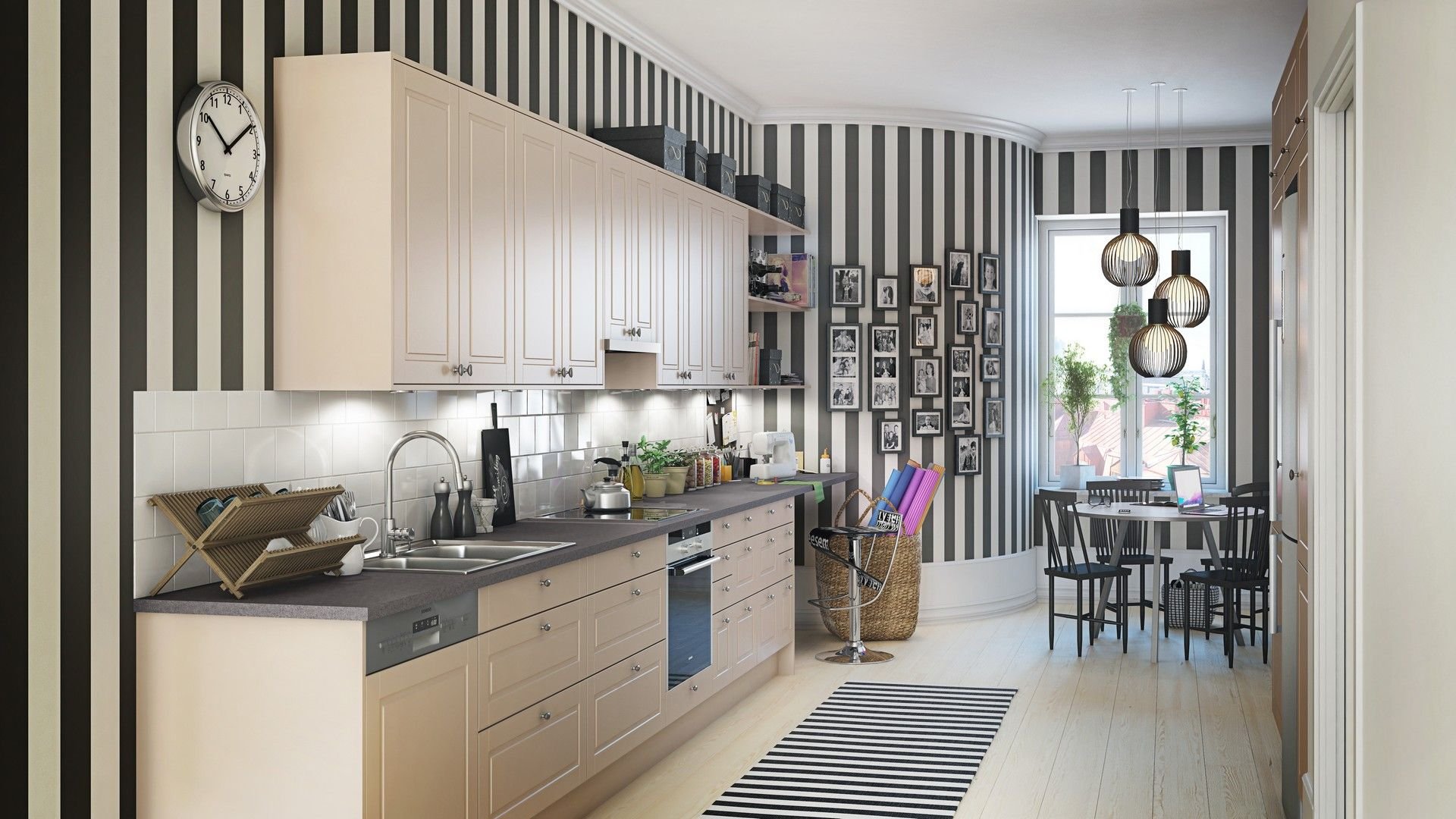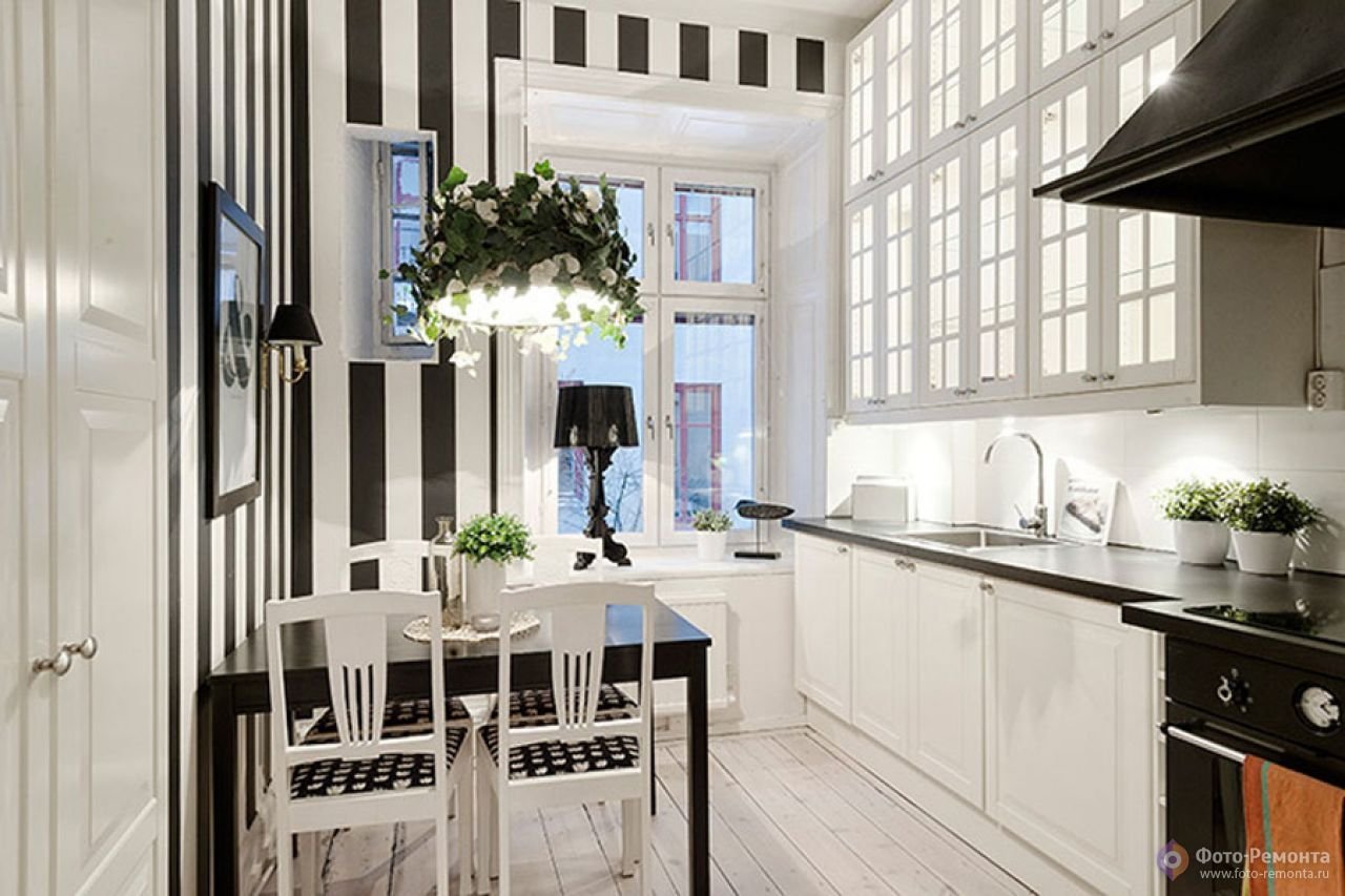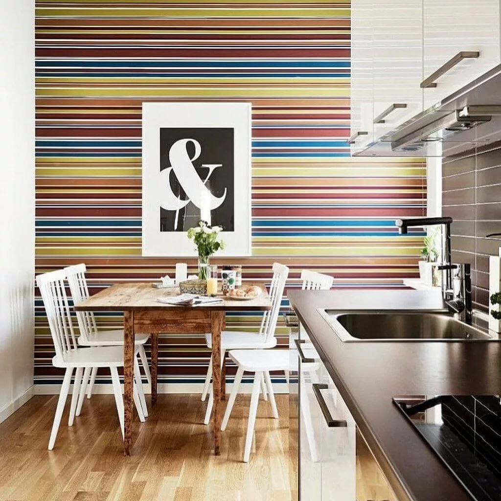 Полосатые обои в интерьере кухни
