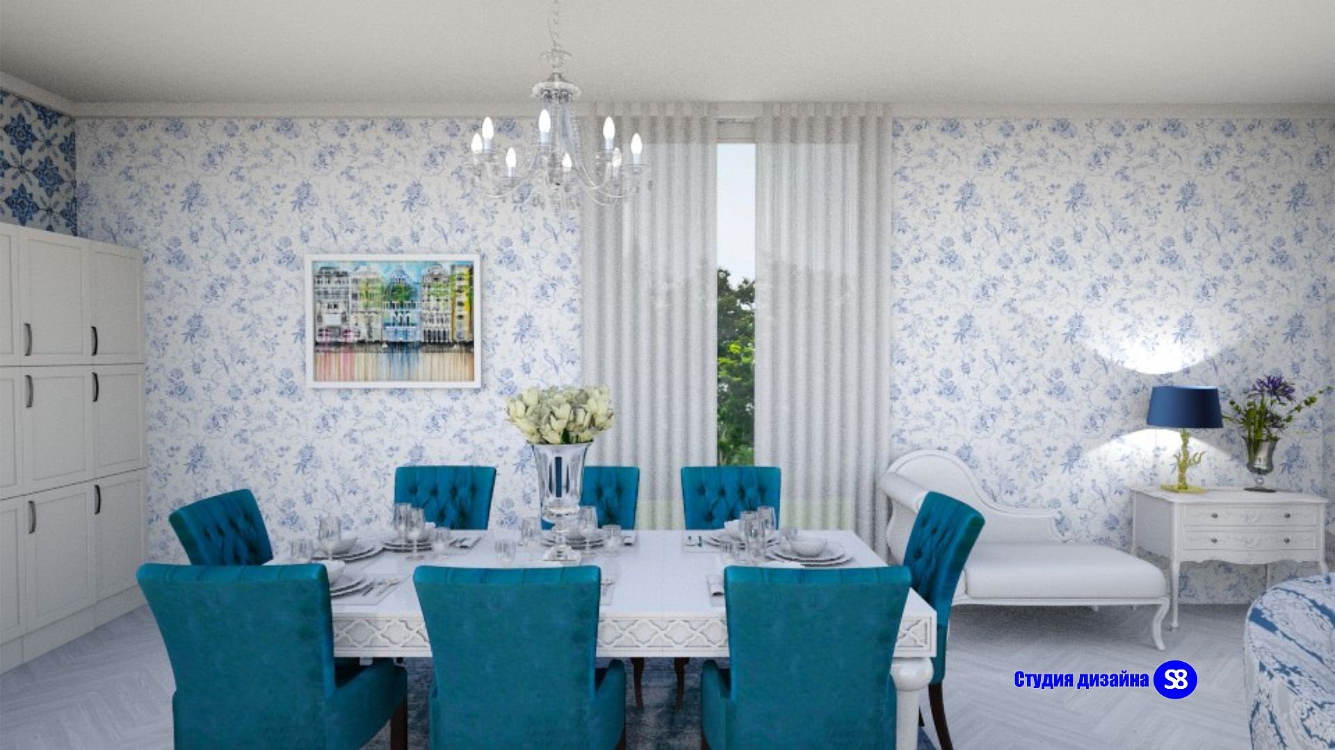 Голубые обои на кухне