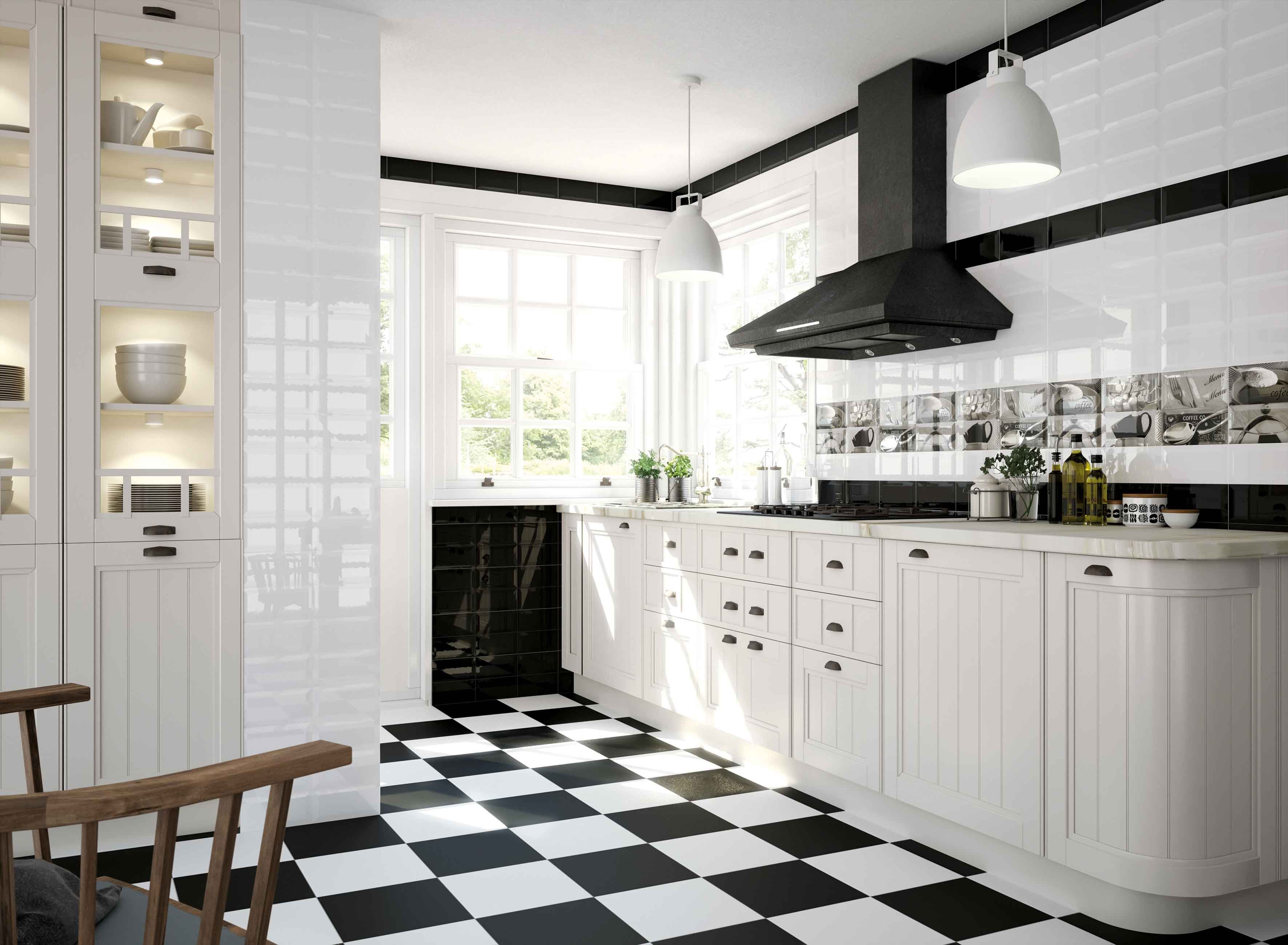 Черно-белая плитка на пол в кухне