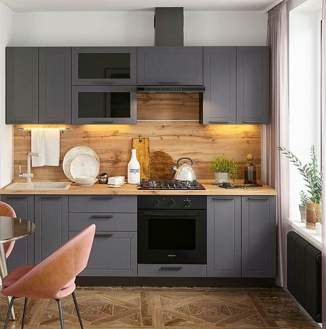 Розовая кухня с деревянной столешницей