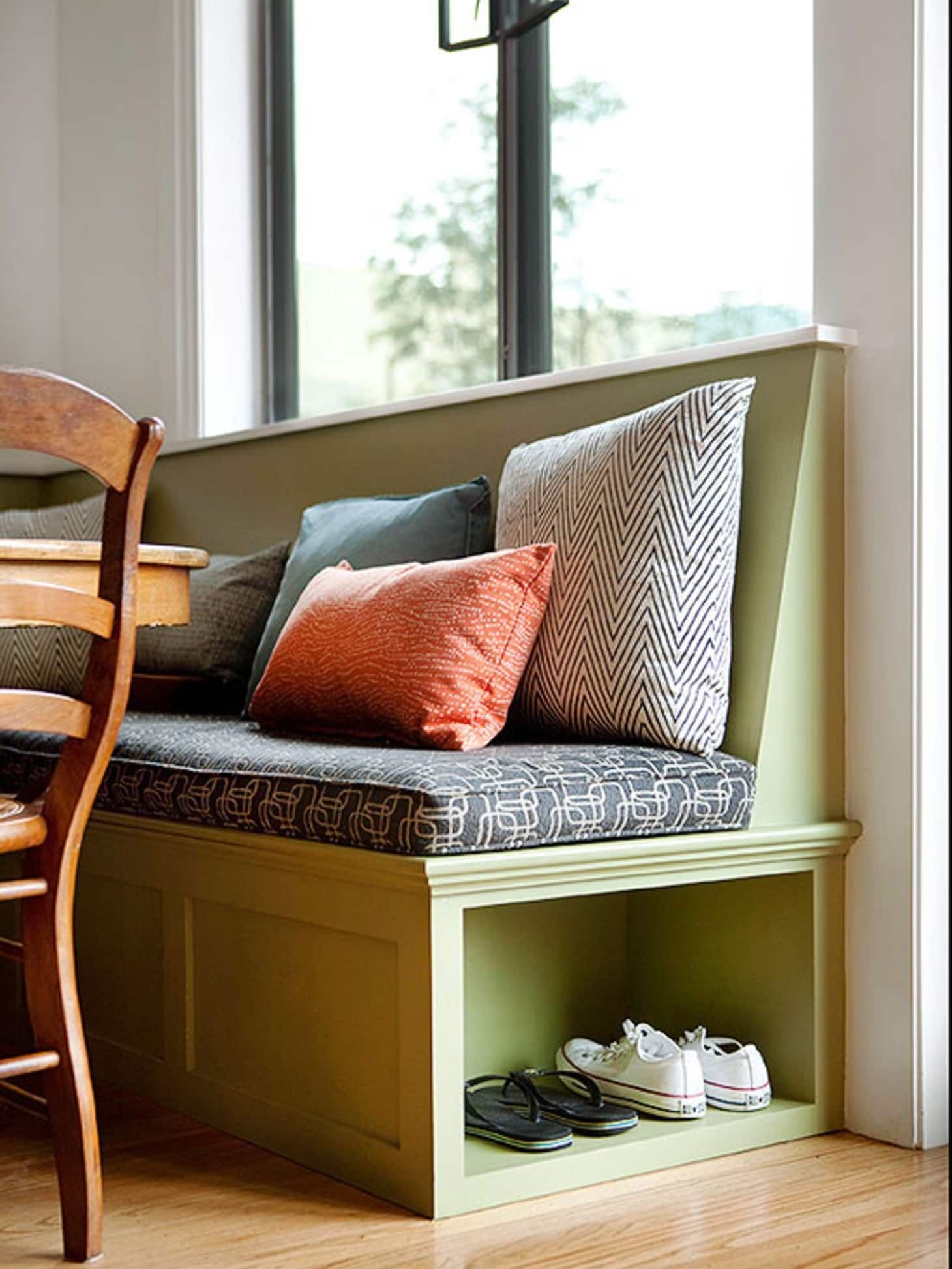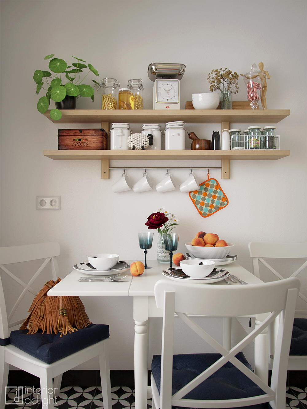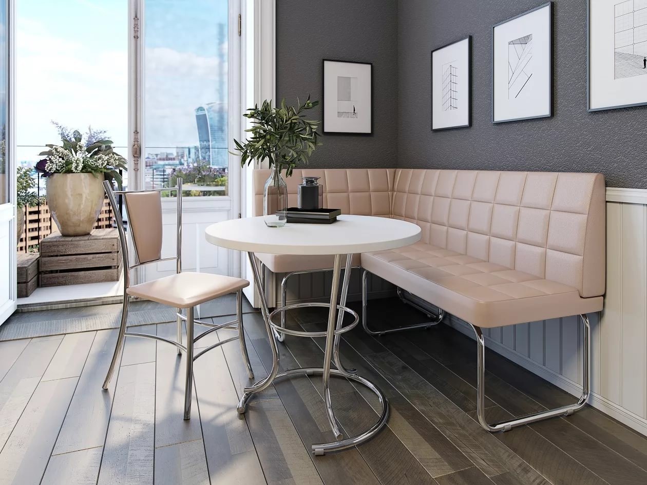 Маленькая кухня с круглым столом и сидушкой скамейкой