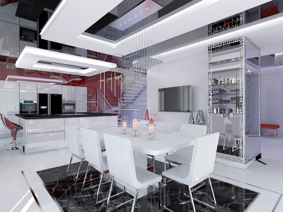 Интерьер кухни столовой в стиле хайтек