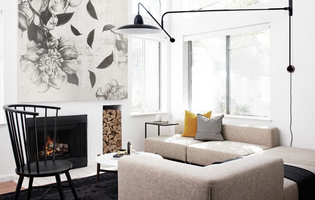Небольшая гостиная в скандинавском стиле с угловым диваном в доме
