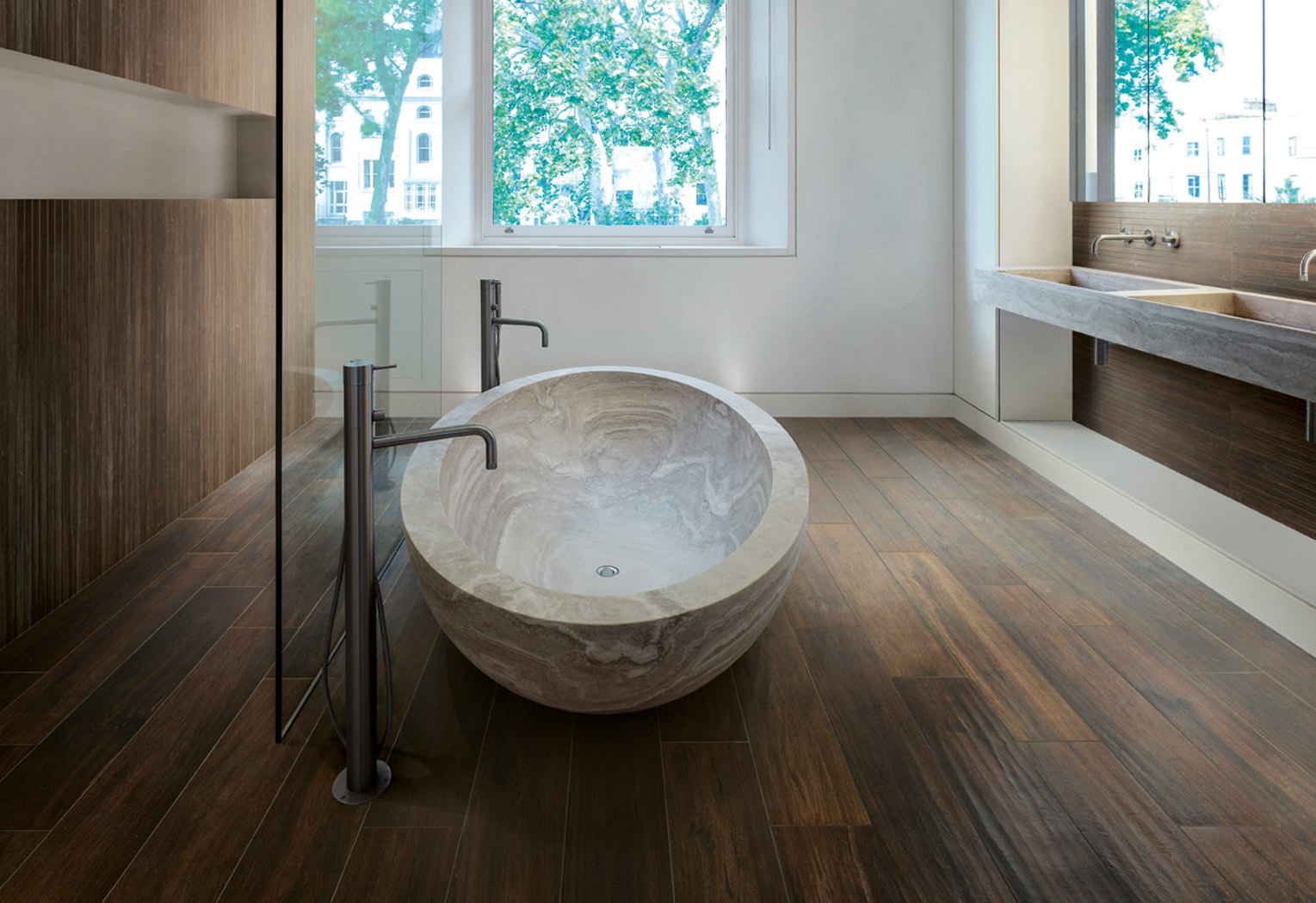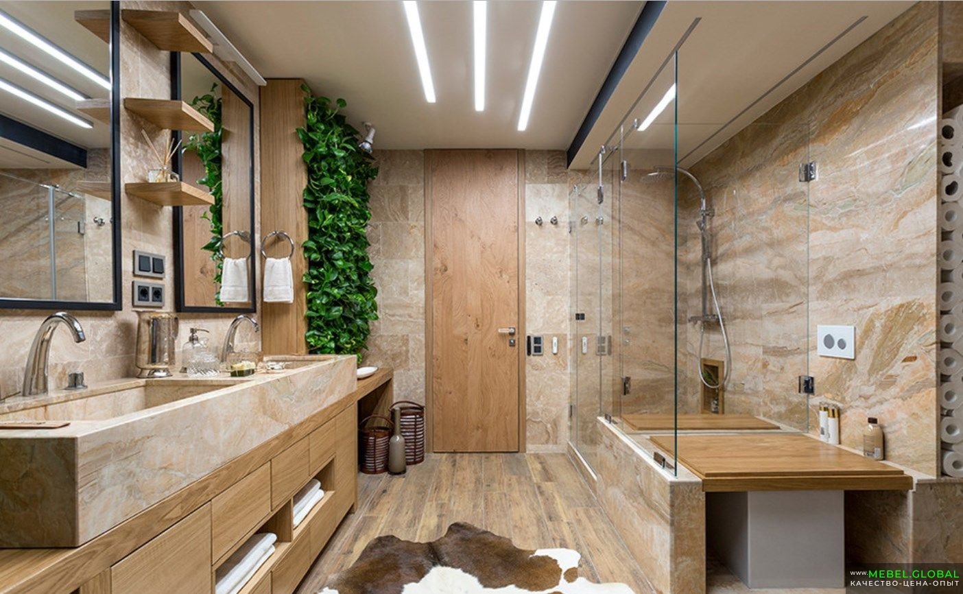 Мрамор и дерево в интерьере ванной