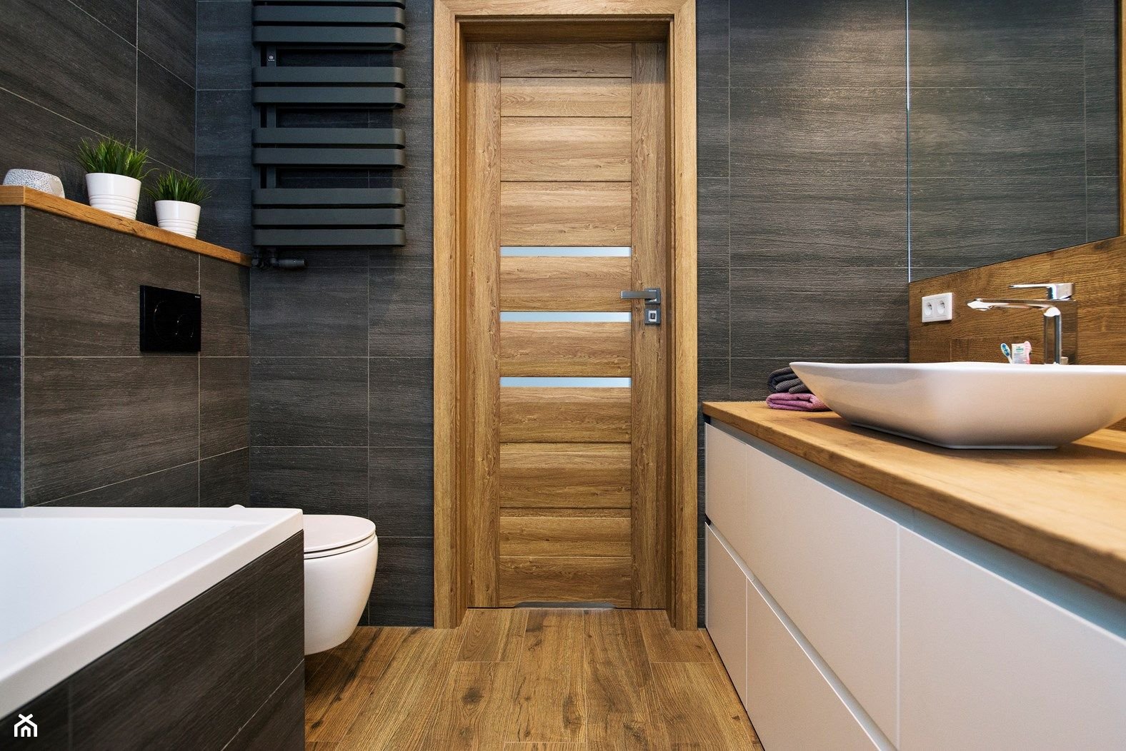 Интерьер ванной с плиткой под дерево