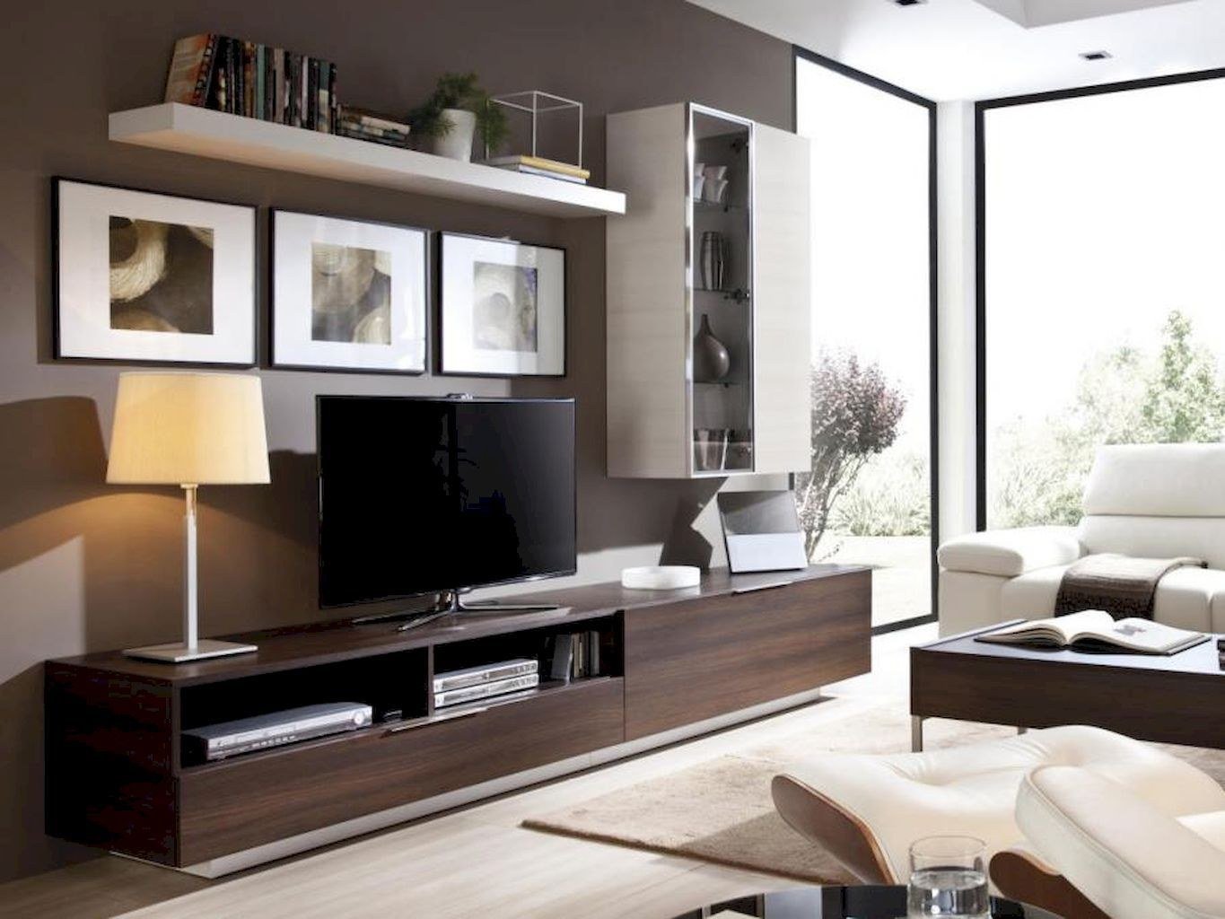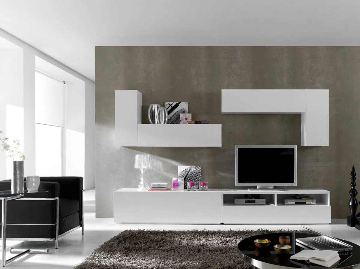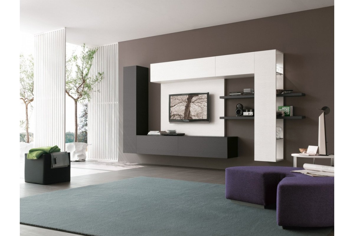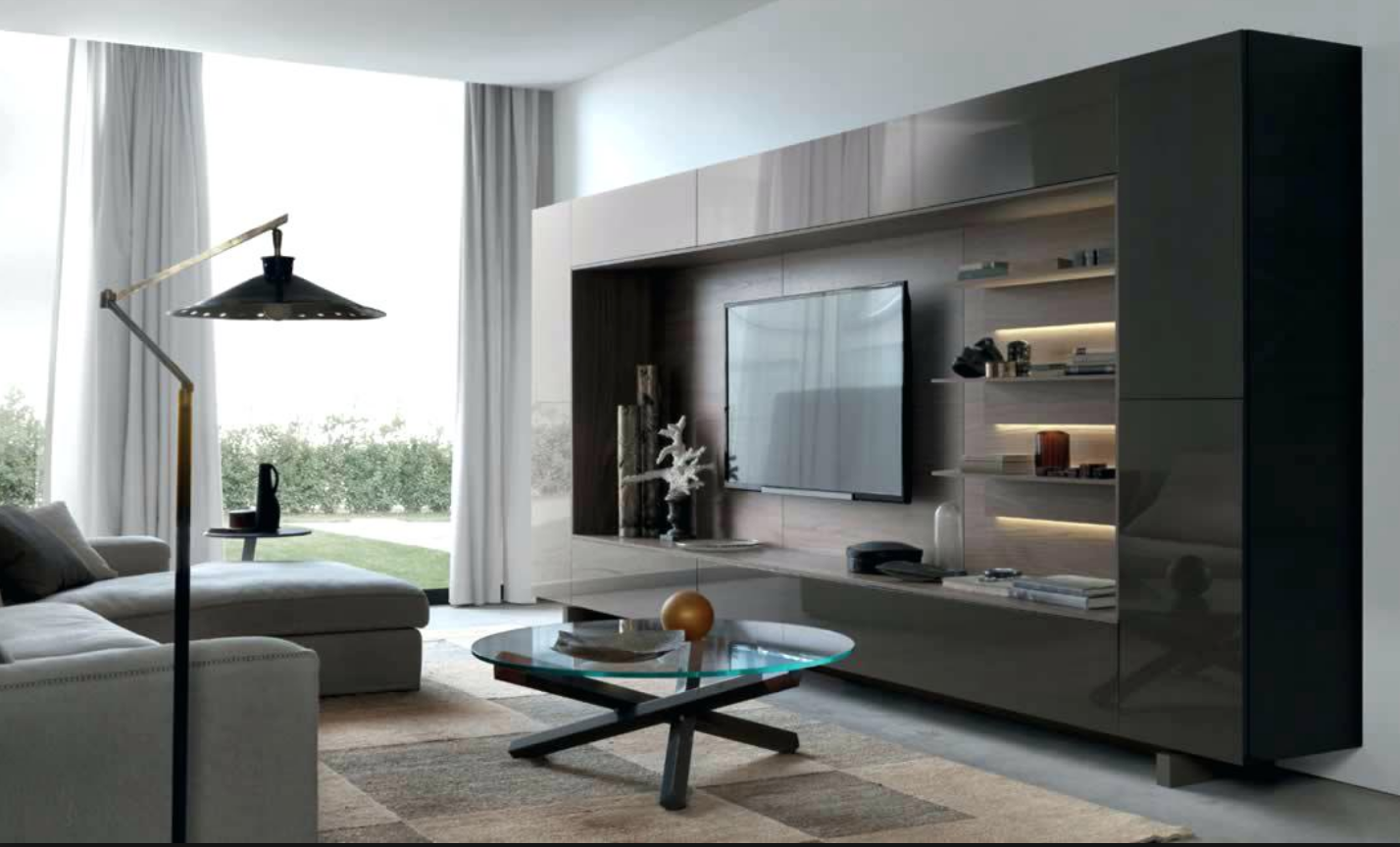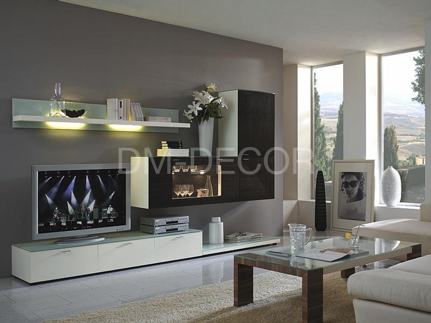 44. Горка в гостиную в современном стиле с телевизором на стене