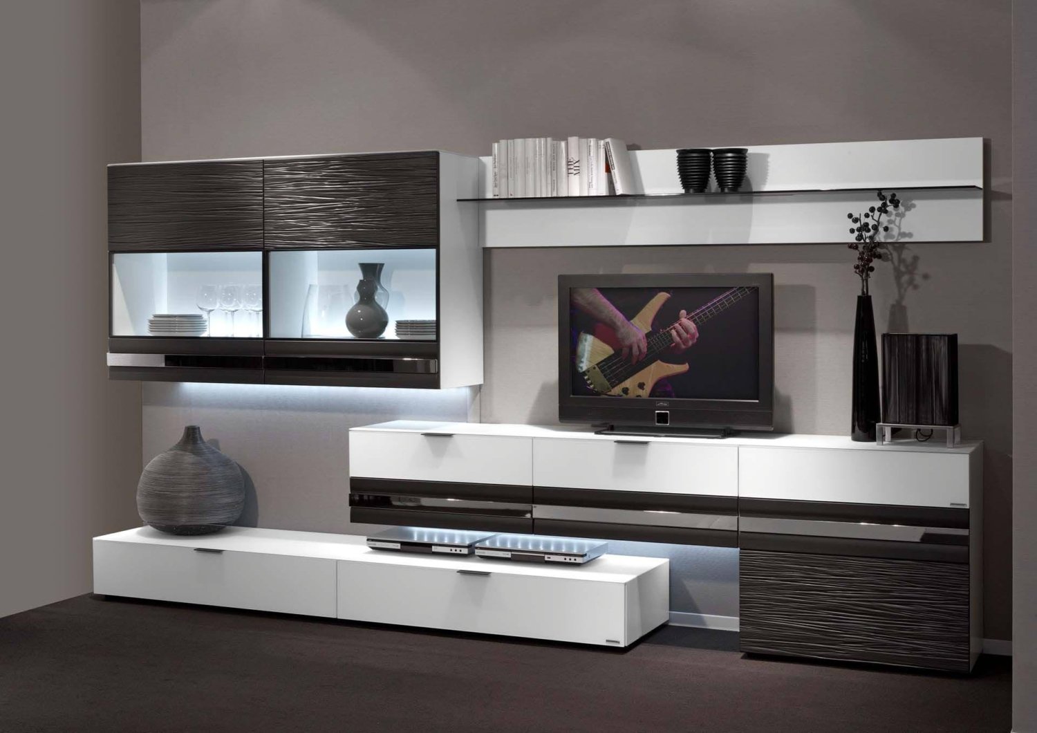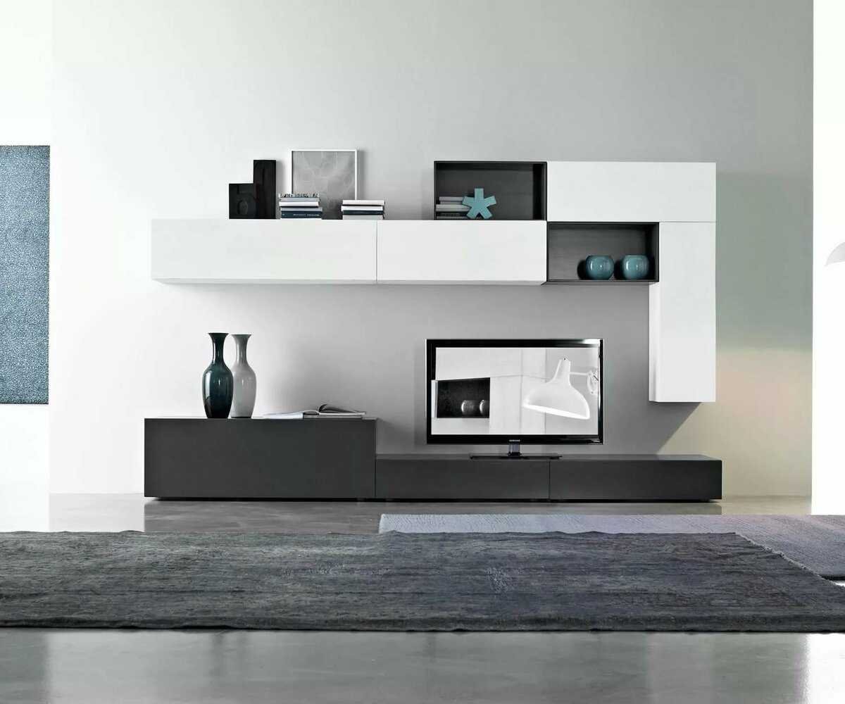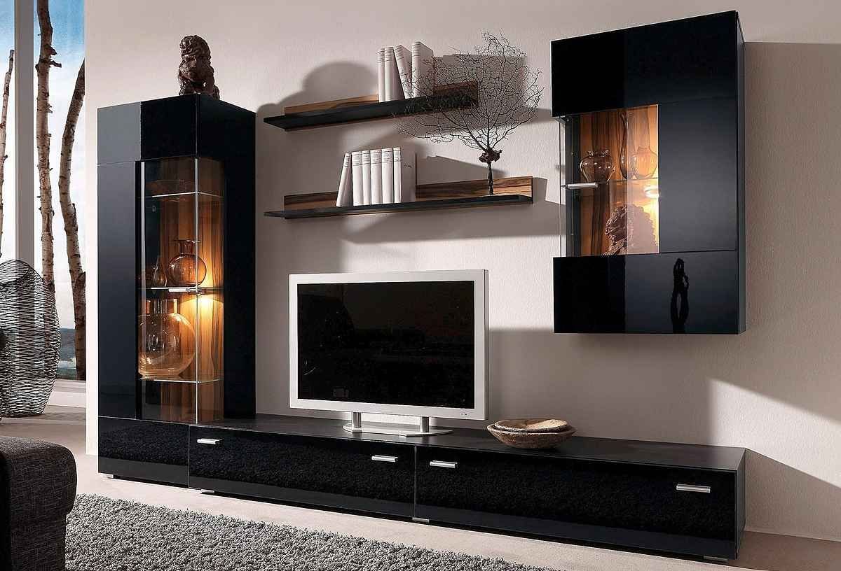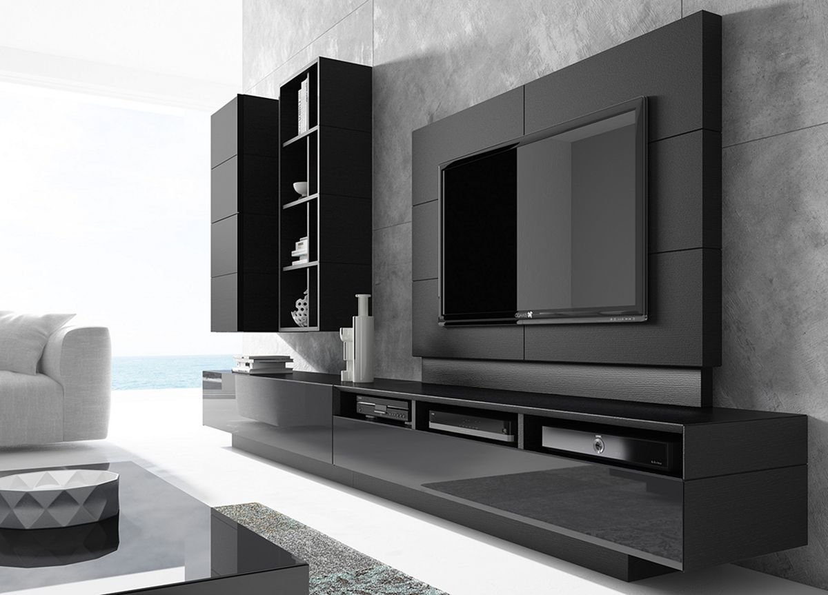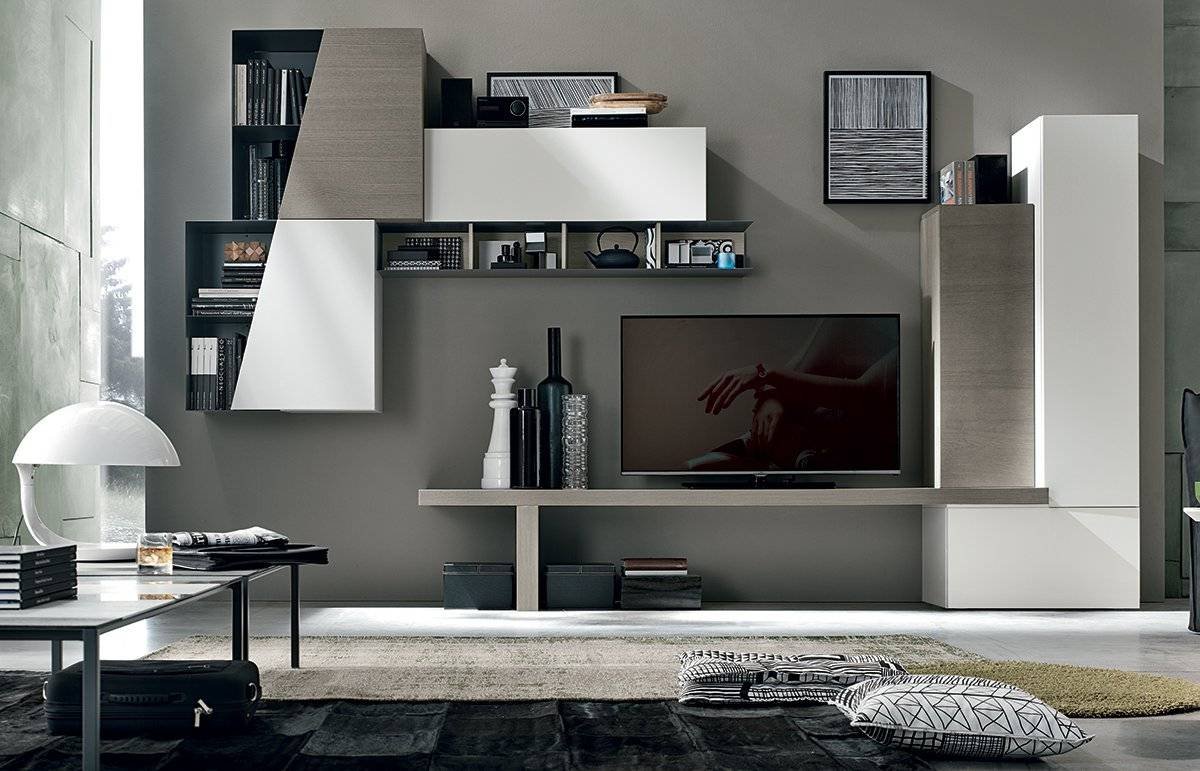 44. Горка в гостиную в современном стиле с телевизором на стене