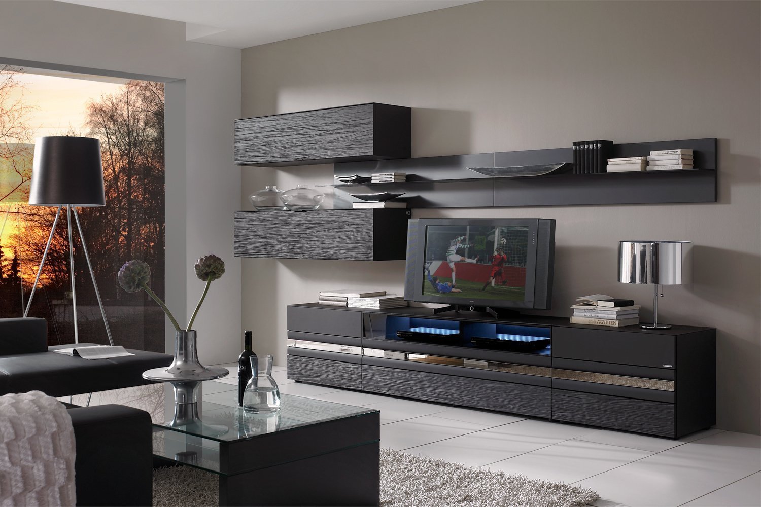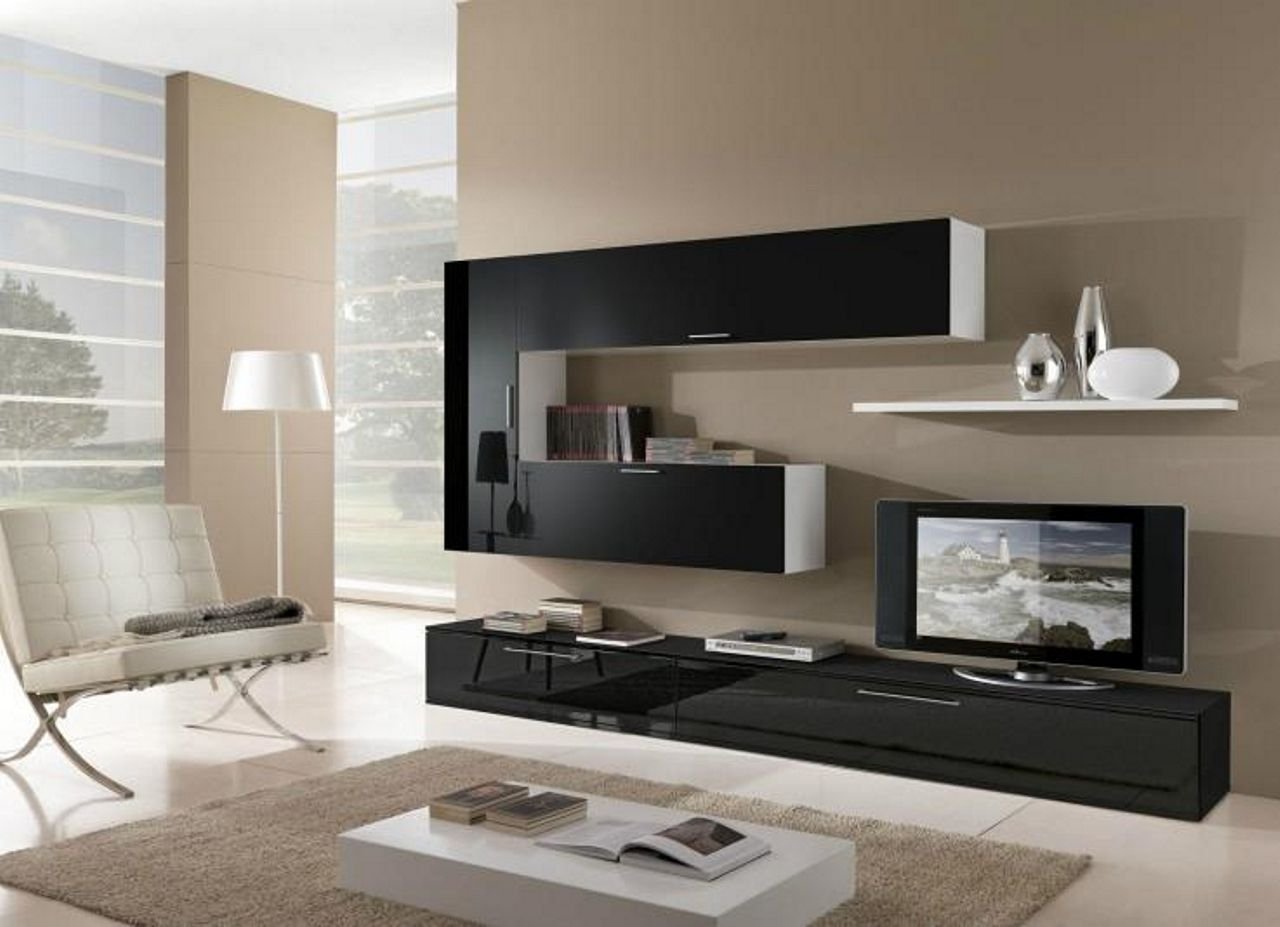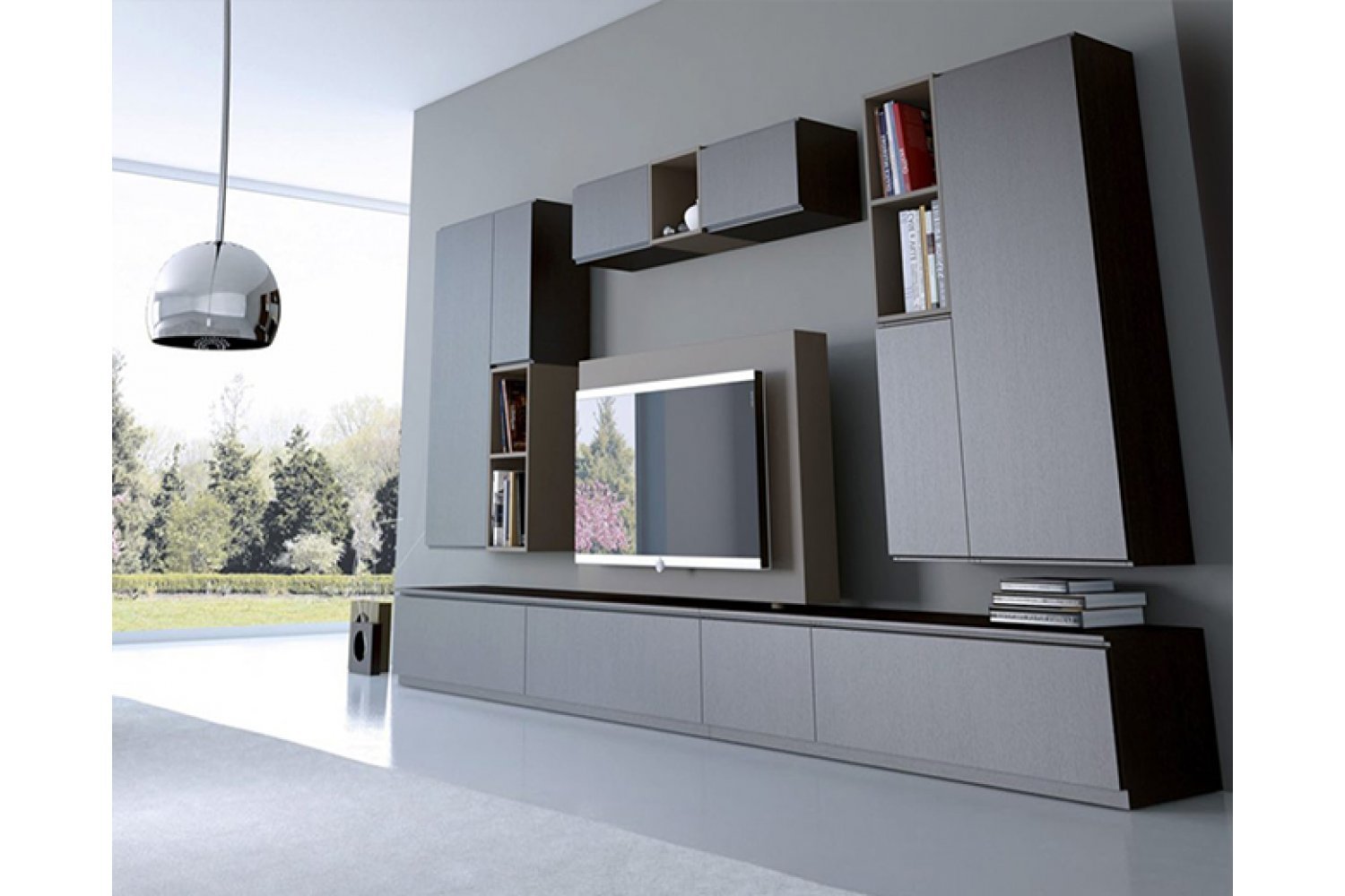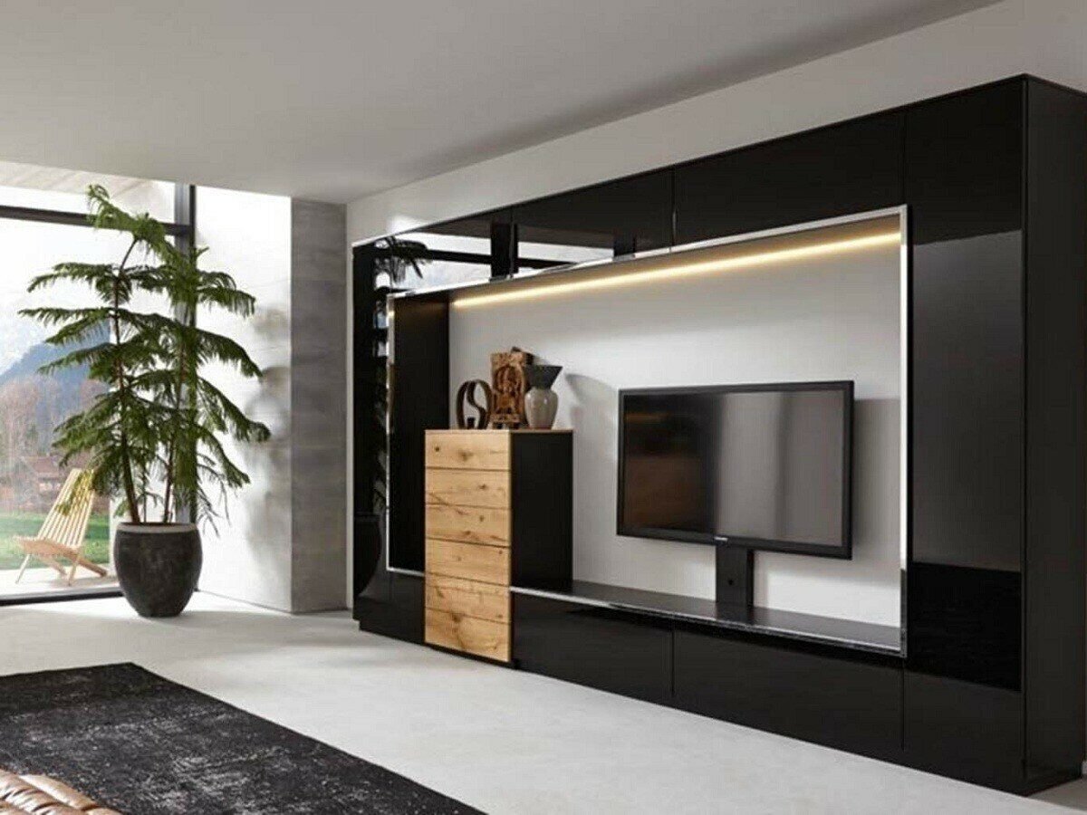 44. Горка в гостиную в современном стиле с телевизором на стене
