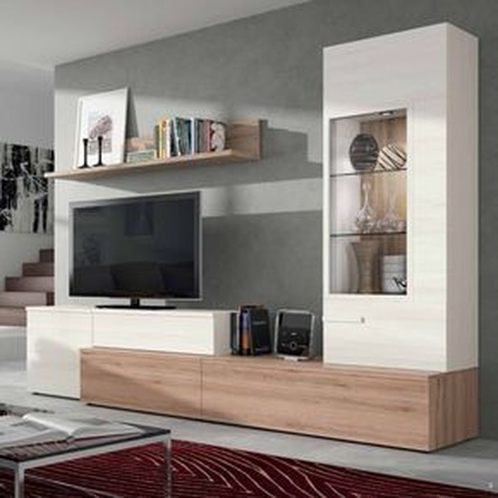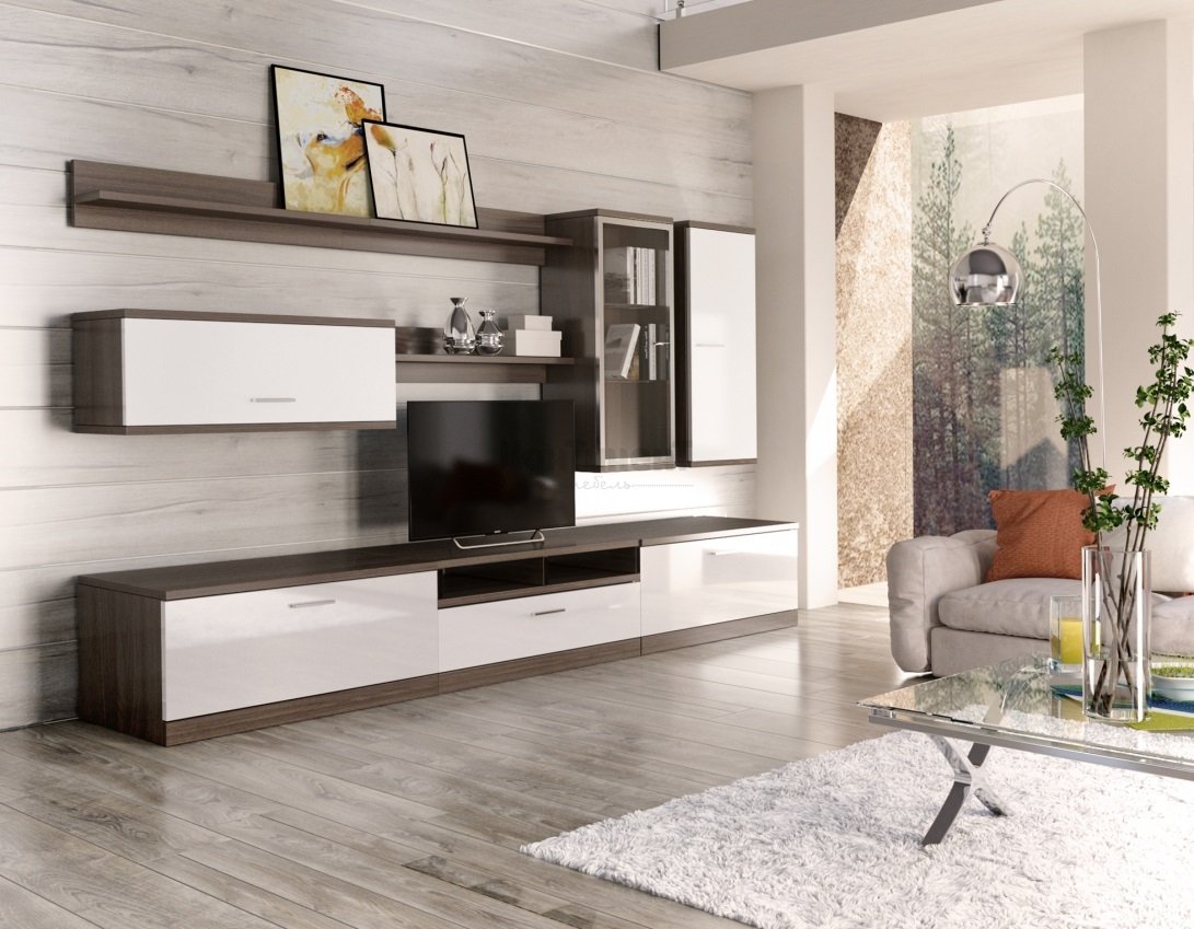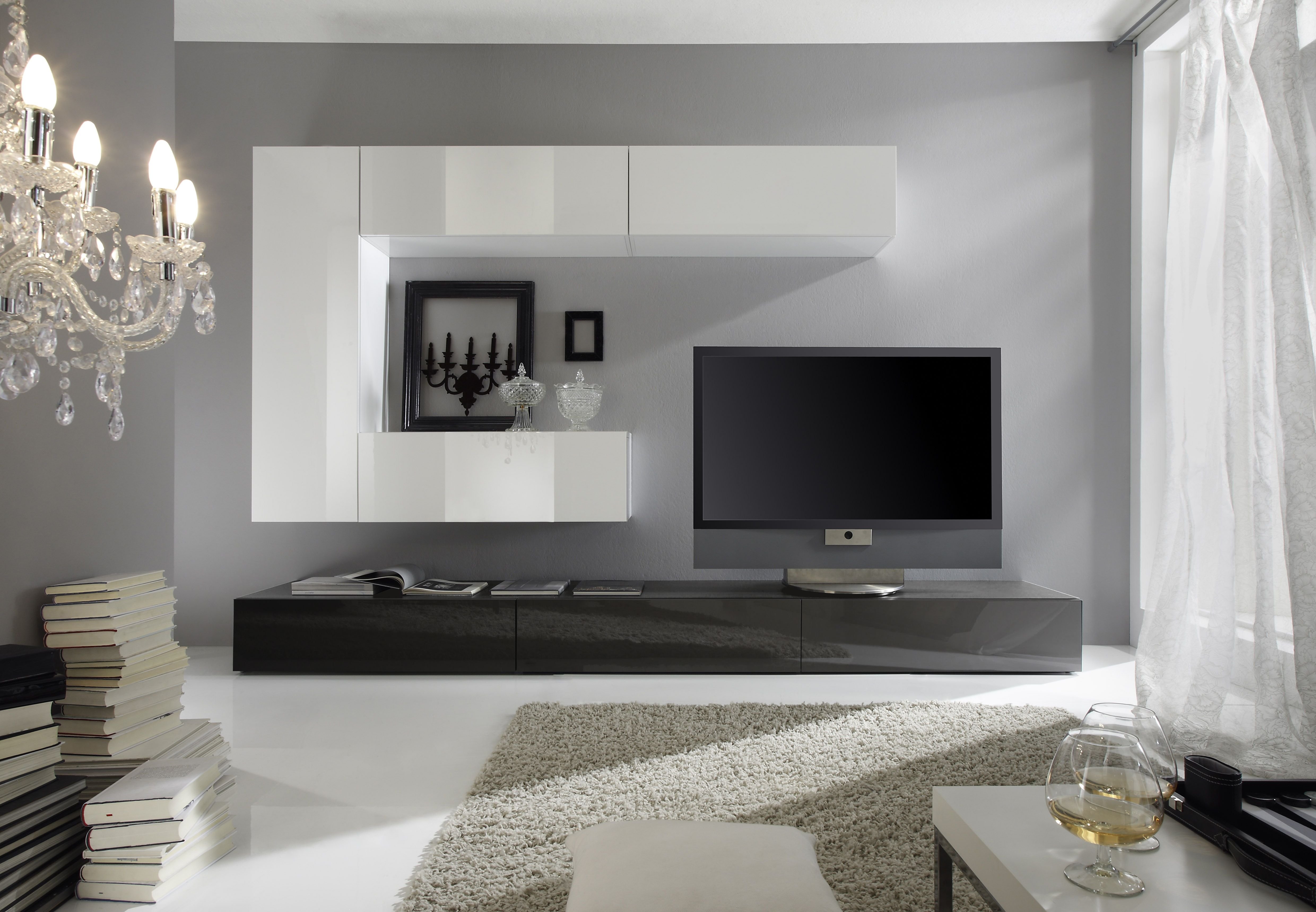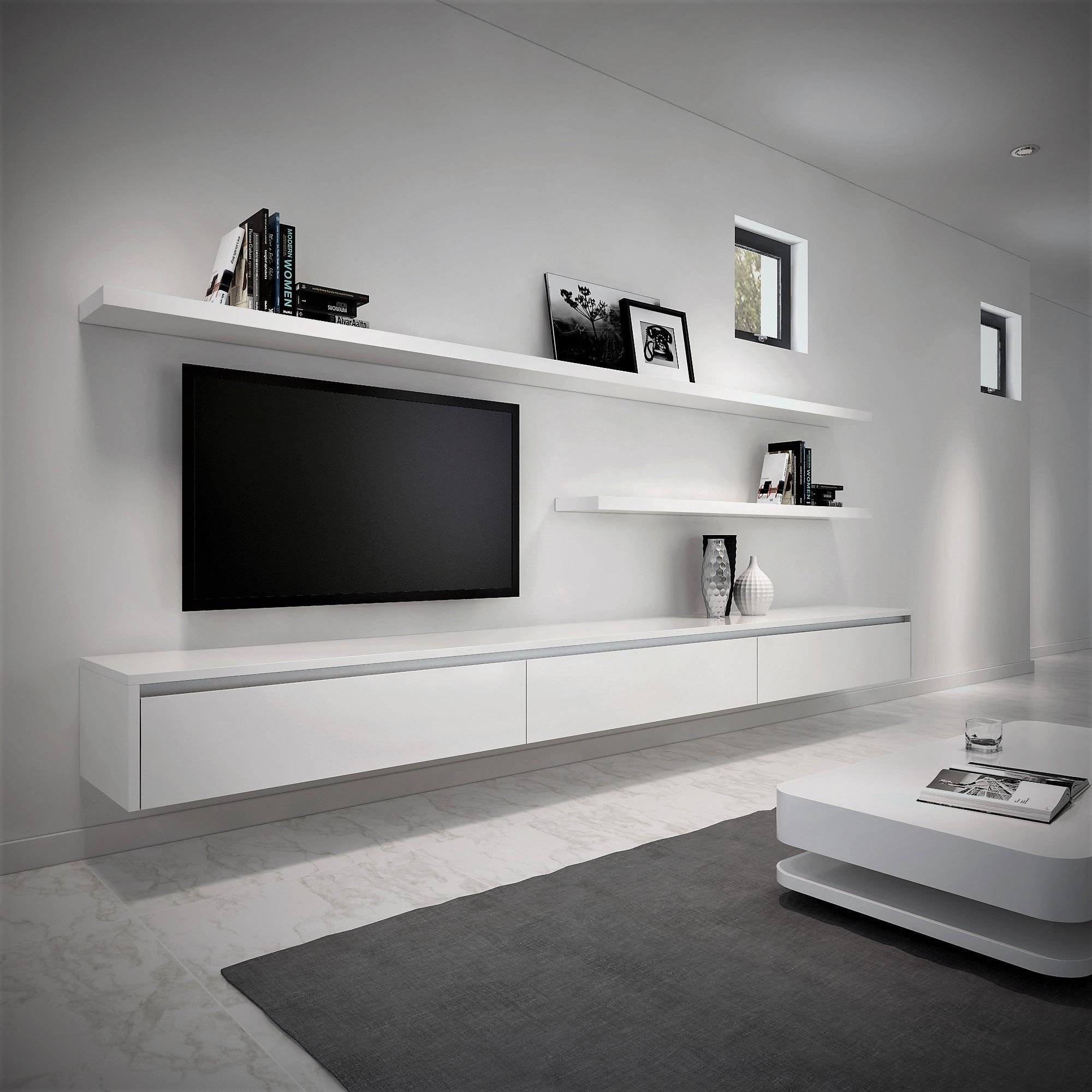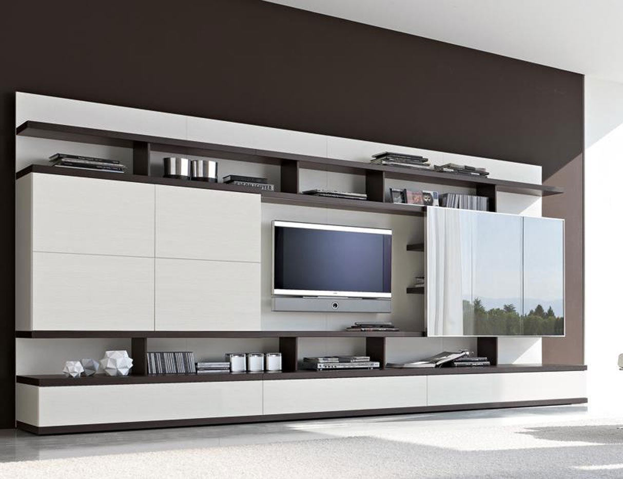 44. Горка в гостиную в современном стиле с телевизором на стене
