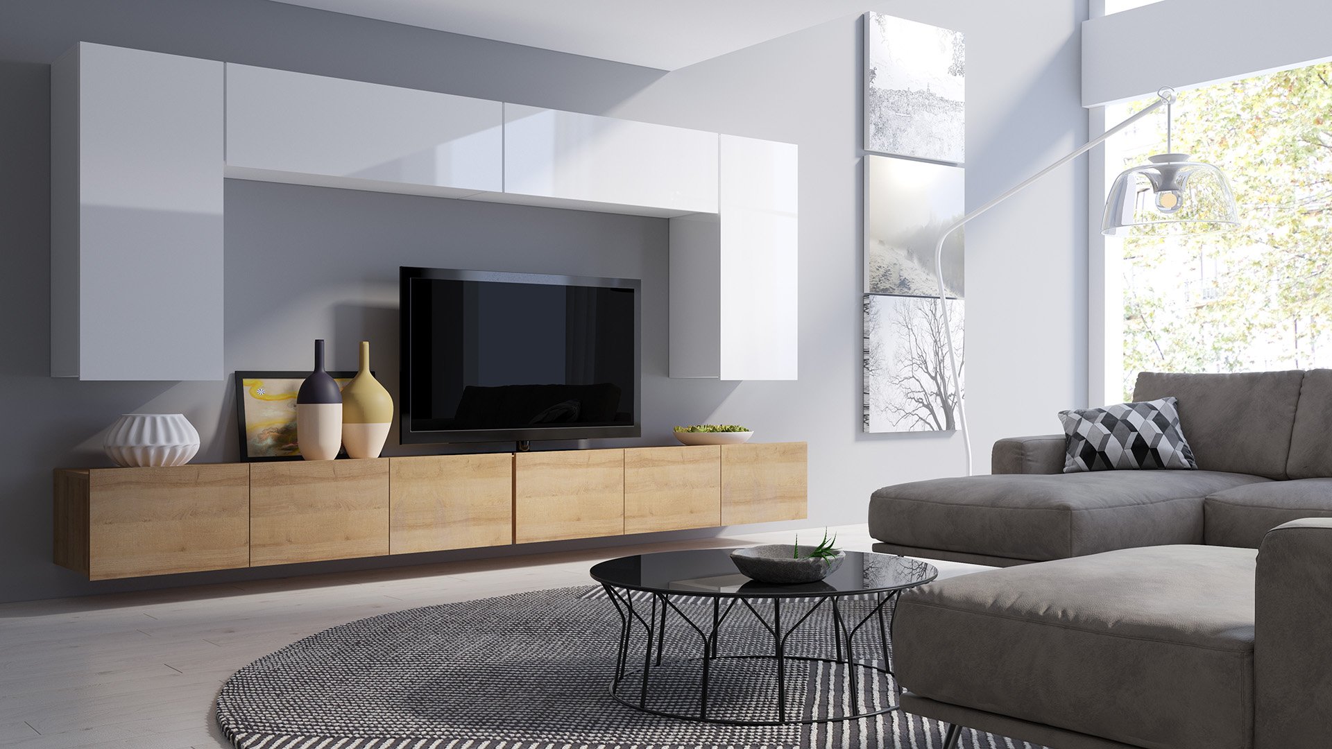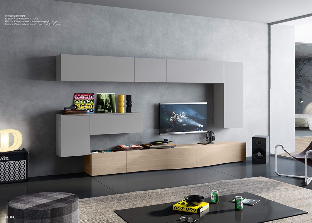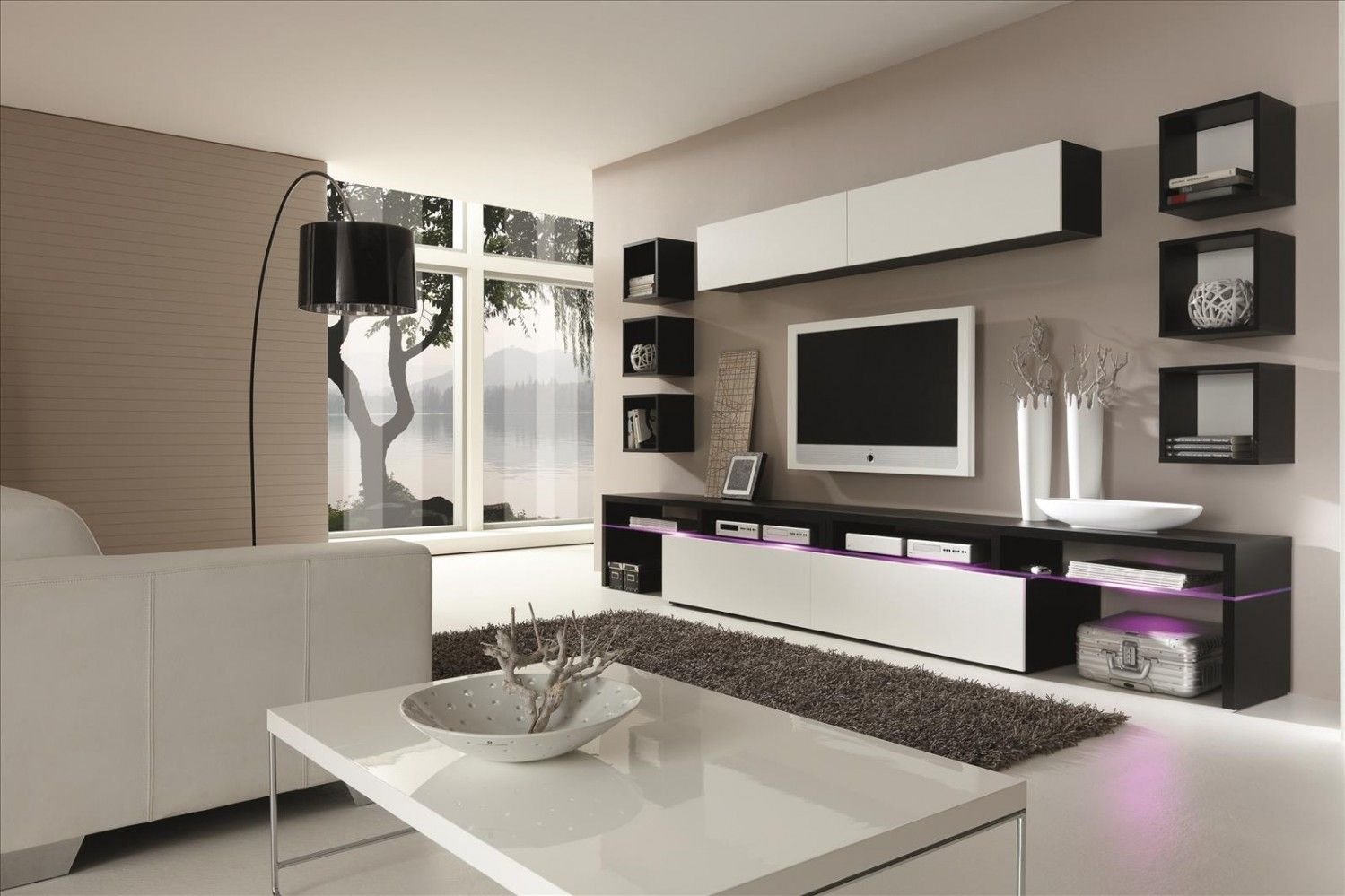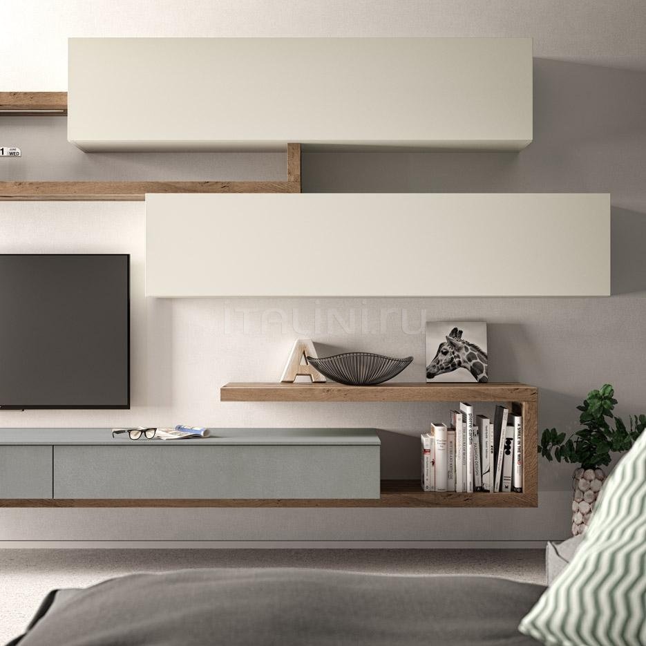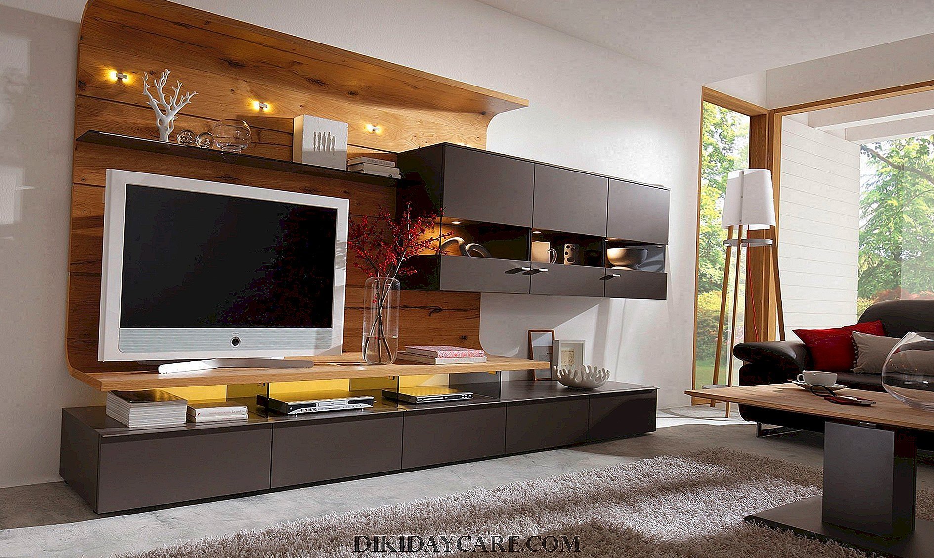 44. Горка в гостиную в современном стиле с телевизором на стене