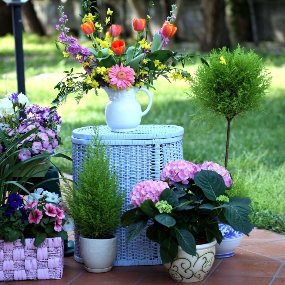 5. Цветы в горшках в саду